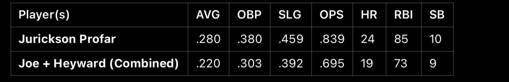 ❌ Offensive upside – Profar’s OPS (.839) and 24 home runs are hard to replace, especially with Joe and Heyward’s declining power.